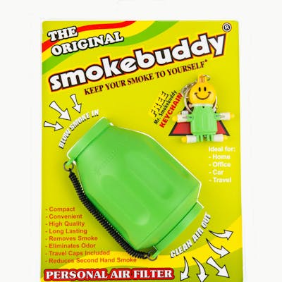 The Smokebuddy Original is a handy, and reliable personal air filter. Simply exhale your smoke through your easy-to-use Smokebuddy and odorless air comes out the other end. Smoke where you want, and when you want without anyone knowing the wiser. Keep second hand smoke away from friends, family, and neighbors with your Smokebuddy. Includes - Smoke Buddy Keychain with LED light Travel Caps Included for storing discreetly Environmentally friendly product Keeps second hand smoke away from friends, family, and neighbors Convenient and compact Magically removes smoke and odor Estimated at 300 uses or more
