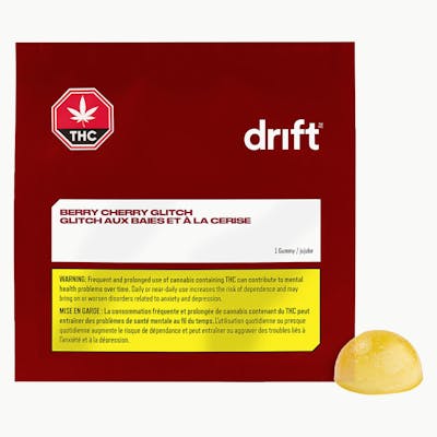 Drift Berry Cherry Glitch is a single, high-potency soft chew infused with 10mg of evenly dosed THC and a blend of sweet berry flavours with tangy cherry undertones. Thanks to our state-of-the-art emulsification process, you can enjoy your experience with very minimal, if any, cannabis taste or smell.