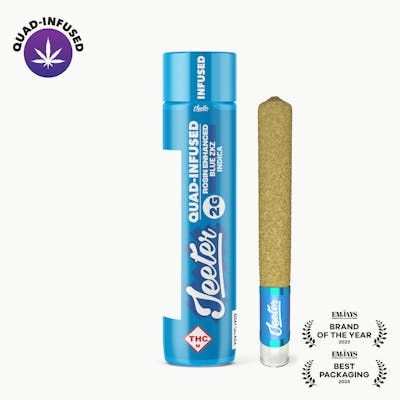 Blue ZKZ is an indica cross of Blue Diamond and Zkittlez. This odoriferous flower offers a terpene profile of tart citrus, sweet earth, and wildflowers. The physical effects of this strain is mellow. Effects: Blue ZKZ has a mellowing effect that is perfect for the end of the day. Flavors: The Blue ZKZ strain has a candy-like sweet berry and blueberry flavor. Imagine sweet blueberry or blue raspberry lollipops of the good old days. Jeeter Quad-Infused Pre-rolls; Premium flower infused with Liquid Diamonds, Live Rosin, Terpenes and coated with Kief.