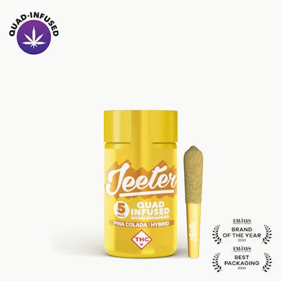 Piña Colada, a Jeeter Mart favorite, is a hybrid strain with an assortment of sweet flavors on the inhale and exhale, such as pineapple and coconut. With a very balanced high, Piña Colada is perfect for any time of the day when you need a pick-me-up or to focus on your tasks at hand. It’s 5 o'clock somewhere, so light up and relax with a nice Piña Colada. Jeeter Quad-Infused Pre-rolls; Premium flower infused with Liquid Diamonds, Live Rosin, Terpenes and coated with Kief.