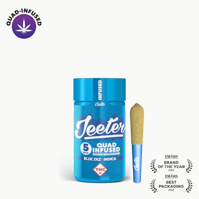 Blue ZKZ is an indica cross of Blue Diamond and Zkittlez. This odoriferous flower offers a terpene profile of tart citrus, sweet earth, and wildflowers. The physical effects of this strain is mellow. Effects: Blue ZKZ has a mellowing effect that is perfect for the end of the day. Flavors: The Blue ZKZ strain has a candy-like sweet berry and blueberry flavor. Imagine sweet blueberry or blue raspberry lollipops of the good old days. Jeeter Quad-Infused Pre-rolls; Premium flower infused with Liquid Diamonds, Live Rosin, Terpenes and coated with Kief.