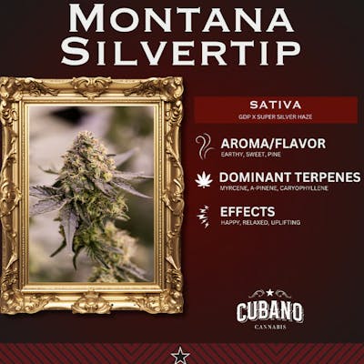 Bright, fresh, and full of good vibes, Montana Silvertip is your go-to sativa for sunny moods and creative energy! With sweet, earthy pine notes and a terpene trio of myrcene, a-pinene, and caryophyllene, this strain lifts your spirits while keeping you chill. Perfect for daytime adventures, big ideas, or simply feeling your best!