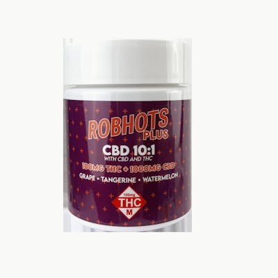 Elevate your wellness with our Robhots Plus line, offering gummies designed for the people. This 10-pack brings you a balanced 10:1 ratio of CBD to THC, delivering 100mg of CBD and 10mg of THC in each gummy. Dive into the therapeutic benefits of CBD while enjoying the subtle effects of THC and the activation/relief that occurs when both are present in every bite. The pack features three distinct flavors - Grape, Tangerine, and Watermelon - ensuring a flavorful and tailored experience. With Robhots Plus Gummies, find relief and relaxation in every bite, crafted for those seeking the perfect blend of cannabinoids. Discover a new level of well-being with gummies designed for you. Flavors Included: Grape Tangerine Watermelon Product Breakdown (dosage info): 10x 100mg CBD & 10mg THC Gummies