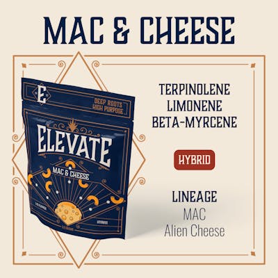 Elevate MO’s Mac & Cheese is everything you want in a hybrid. These densely-packed, cheesy buds have a sour citrus and buttery flavor with a strong, skunky smell. Mac & Cheese is perfect for a rainy day or when you simply want to kick your feet up for a bit. This hybrid of MAC and Alien Cheese provides a happy, uplifting feeling with balanced mind and body relief. In higher doses, this strain may encourage [cheese joke about melting]. Elevate Missouri’s Mac & Cheese was crafted with the terpene lover in mind. This terpene profile leads with Terpinolene, Limonene, and beta-Myrcene. Each one boosting the strain and the other terpenes around it.