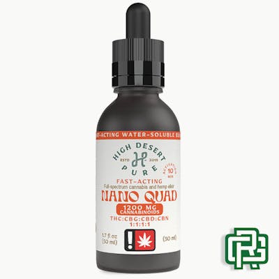 1:1:1:1 THC:CBD:CBN:CBG + Hybrid | Flavor: Mango Pineapple | "Nano Quad" is a 50mL fast-acting, water-soluble, nano-emulsified elixir. 1 dose = 1mL dropper with the whole bottle having 50 servings. | 4.5mg each cannabinoid/serving | 225mg each cannabinoid/container | Average Activation Time: 10 minutes (can take up to 2 hours) | 900mg Total Active Cannabinoids (TAC)