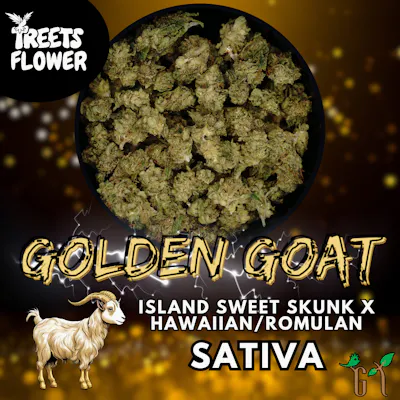 Golden Goat is a Sativa-dominant cross between a male Hawaiian-Romulan and a female Island Sweet Skunk. This strain is reported to have been created in Kansas as a result of an unplanned pollination event between the Hawaiian father and Sweet Skunk mother, and first made available in Colorado in 2009.