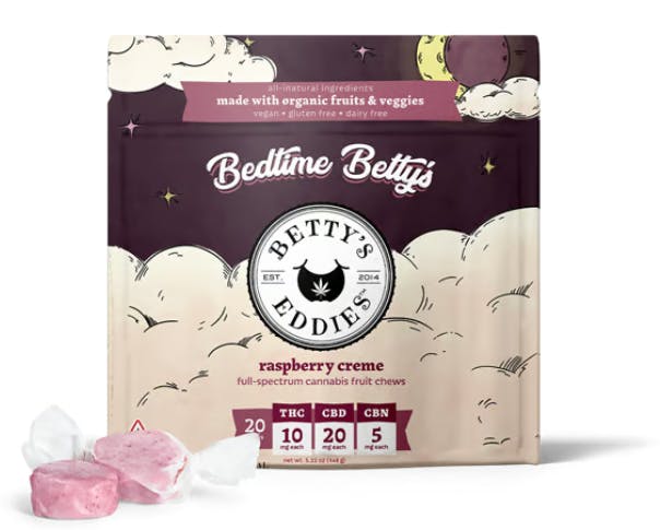 Tired of being tired? Betty's got your back. Our newly formulated Bedtime Betty's recipe infuses a dreamy blend of THC, CBN, and CBD into raspberry creme chews. Betty's Eddies™ handcrafted fruit chews are made with all-natural ingredients and a whole lotta love. We use organic fruits & veggies, full-spectrum cannabis, supporting cannabinoids, and herbal supplements & vitamins to help you feel your Betty best no matter what life throws at you. Life is better with Betty’s.