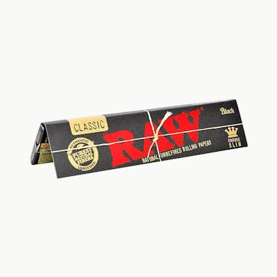 Raw Classic Black 1 1/4 Rolling Papers 50 leaves per pack. These classic RAW papers offer unmatched, unrefined cleanliness to your smoke sessions– no more worrying about additives or dyes! | Features: 50 leaves each | Pure, clean tasting smoke that is best described as natural, light and pure | Exclusive cross pattern watermark, which minimizes runs and odd burning of the papers for a more even burning smoking experience. | All Natural, Additive-Free, 100% Vegan | Translucent Ultra Thin Rolling Paper | Raw papers are made of pure Hemp Paper and Hemp Natural Gum!