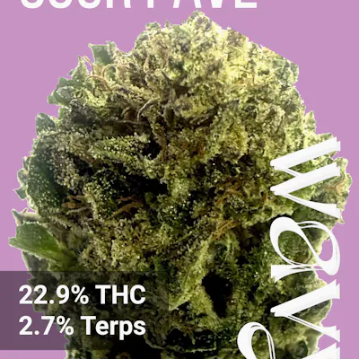 Sour Pavé is a resin-heavy Indica-dominant strain that delivers rich, dessert-like sweetness on the inhale, followed by a cool menthol finish. With terpene profiles dominated by sour candy notes and subtle hints of gas, this flower is your go-to for evening wind-downs or post-work recovery. Expect physical relief, full-body relaxation, and a soothing, mellow vibe that sets the tone for restful nights or deeply introspective sessions. Perfect for both pain management and sweet indulgence.