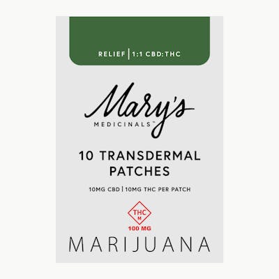 Mary's 10 Pack Patches Mary’s award-winning Transdermal Patches are now available in a 10-pack for everyday self-care. Each 10-pack of Mary's Patches contains 2x2" squares that simply adhere to any veinous part of the skin, providing 8-12 hours of discreet systemic relief. Relief (1:1) Patch: Our Relief Transdermal Patch, with a 1:1 CBD:THC ratio, is designed to promote relief from common aches and pains in your daily life. Our Everyday Relief products are formulated with natural ingredients that provide systemic relief from daily stressors. Winner of the 2023 Michigan and SoCal High Times Cups, Mary’s Medicinals Relief Transdermal Patch is sure to be a winner in your book as well.