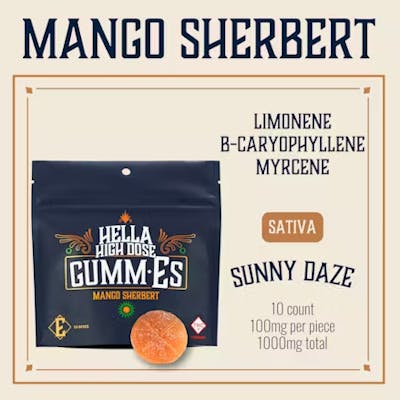 Take a mini vacation with Mango Sherbert Hella High Dose Gumm-Es, a sativa blend crafted to bring you Sunny Daze with each carefully dosed chew: 100mg per piece, 10 pieces per pack, 1000mg total. Choose your moment: chews to boost your mood. Terpenes: Limonene, b-Caryophyllene, Myrcene Hella High-Dose Gumm-Es are expertly crafted to deliver everything you want, nothing you don't: - Superior Cannabis - Organic Ingredients - Vegan and Gluten-Free - No Artificial Coloring - No High-Fructose Corn Syrup Intriguing flavors, enticing texture, precise dosing—experience edibles on another level.