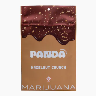 "Indulge in the rich taste of Swiss milk chocolate, Opus Lait (“Opus Lay”) and hazelnut gianduja (“john-DO-ya”)—a smooth hazelnut blend mixed with milk chocolate. Crunchy candied hazelnuts and a sprinkle of sea salt complete this bar, offering the perfect balance of creamy sweetness and savory crunch in every bite. Panda Chocolate is churned for a full day with predosed cocoa butter to ensure even dosing and maximum efficacy. Always ethically and sustainably sourced. 300mg THC distillate per package. 30mg THC distillate per square, 15 per triangle."