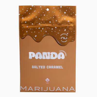 "Crunchy caramel sugar imbedded in sweet and savory “Dulcey” caramelized white chocolate, topped with sea salt flakes. Panda Chocolate is churned for a full day with predosed cocoa butter to ensure even dosing and maximum efficacy. Always ethically and sustainably sourced. 500mg THC distillate per package. 50mg THC distillate per square, 25mg per triangle. "