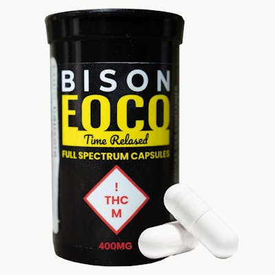 Bison EOCO (Essence of Cannabis Oil) is a cutting-edge full-spectrum time-released capsule designed with four activating oils, giving you three distinct medication waves. Wave 1 - The "Head High" - Coconut Oil - 0 to 2.5 Hours In - A creative euphoric, social high activated via first-pass metabolism. Great for working out and busy tasks. Wave 2 - The "Body Buzz" - Avocado Oil - 2.5 to 5 Hours In - The buzz evolves; you notice a calming body high kicking in as THC-infused Avocado Oil activates in your portail vein. Wave 3 - The "Med Effect" - Extra Virgin Olive Oil - 5 to 7 Hours In - The THC-infused Olive Oil activates in your lymphatic nodes, giving you a healing, balanced high. Wave 4 - The "Skeletal Wave" - Grapeseed Oil - 7 to 9 to Hours In - For its final act, Grapeseed Oil activates partly in your body's bone marrow, allowing for deep penetration for effective full-body relief. 7 capsules per container.