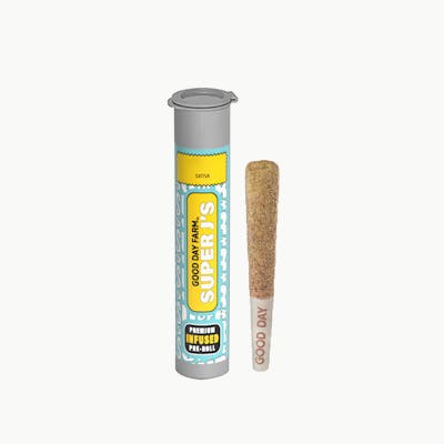 Good Day Farm Super J's are 1g pre-rolls that are super-infused for superior power and superior flavor. But how do we make this indica pre-roll superpowered? We start with Good Day Farm premium, full flower and super-infuse it with an explosion of flavorful terpenes and potent cannabis oil. We take a full gram of that THC-loaded flower, roll it with organic papers, and coat it with a supersuit of premium kief. Super J's are our most potent and flavorful pre-roll, so you can fly a little higher. Strain-Specific | Super-Infused | Ready to Spark Super People. Super Cannabis. Super J's.