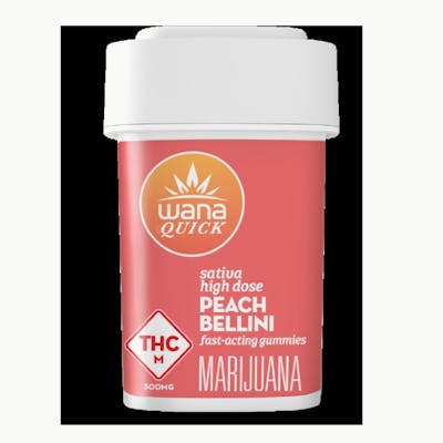 Wana-Quick Fast Acting Gummies-300mg-10ct-Peach Bellini 300mg of THC, 30mg per piece. Fast acting with 5-15 minute onset and 2-4 hour duration. These bubbly peach gummies will add some zip to your day with an energizing terpene-enhanced sativa blend.