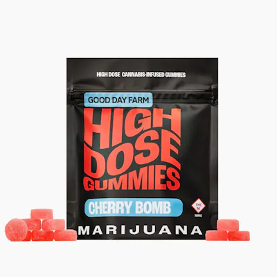 Good Day Farm High Dose Cherry Bomb Gummies deliver a blast of potent cannabis magic and feature a delicious, explosive flavor and a more powerful dose. These gummies are great for patients who are seeking a THC dosage that is more potent than our traditional gummies. These Cherry Bomb gummies are an eruption of sweet and tart flavors! 30mg THC per piece | Activation time is 15-120 min. | Melt-Proof, Gluten-Free, Vegan, Made with Real Fruit Good People. Good Gummies. Good Day.