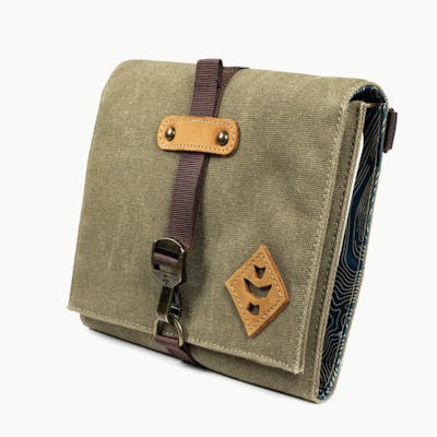 Hemp rolling tray 2 Smell proof pockets 2-Piece hemp grinder Hemp rolling papers Lighter holder (lighter not included) Carbon Filter System Lockable Waterproof zipper Genuine leather accents Metal hardware Dimensions: 8.5” x 6.5” (folded)