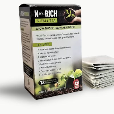 Perfect for beginners and experts alike! N-RICH Vitali-Tea is a 100% ALL NATURAL plant enhancer. Vitali-tea contains all major nutrients N-P-K (nitrogen, phosphorus, and potassium) as well as over 70 micronutrients and a naturally occurring plant growth hormone. The key to healthy and productive plants starts with a healthy root system and a healthy root system starts with using N-RICH Vitali-tea right from the seedling stage.Vitali-Tea can be used as a soil drench (watering), foliar spray, and compost tea enhancer. It’s easy to use…just drop a Vitali-tea tea bag into tap or hose water, let it steep and feed away! You can add N-RICH Vitali-tea to your normal watering schedule & see results after the first use. No burnt leaves – only beautiful green goddesses. N-RICH Vitali-tea is safe (and recommended) to use on all plants including houseplants, flowering plants, succulents, cacti, herbs, veggies, and fruits too! **Sun & Soil Grown in Canada and Made with all Canadian ingredients** Includes 12 teabags (48g). Makes 24L of Vitali-Tea. Improves soil health Includes 12 teabags (48g).