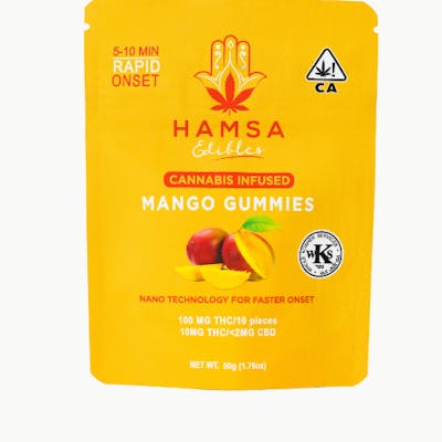 Mango Splash into this tropical pool of euphoria with the Hamsa Hybrid Mango Gummies. An exhilarating blend of nano fast-acting THC and sativa-like terpenes with the intense, sweet flavor of a juicy Mango. Hybrid/Sativa prominent terpenes– 10mg THC per piece. 10 perforated pieces per bag for simple micro dosing. Vegan – Kosher Certified – 5-10 Minute Rapid Onset – Gluten Free – Pectin Based