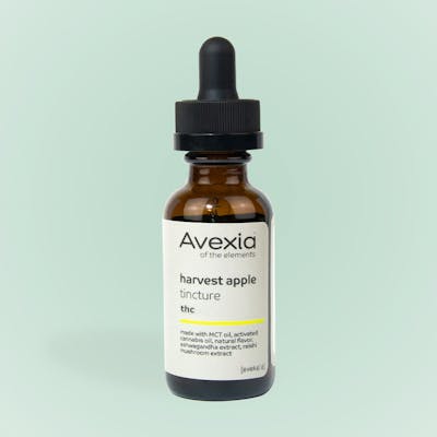 Harvest Apple Tincture by Avexia made with MCT oil, activated cannabis oil, natural flavor, ashwagandha extract, reishi mushroom extract. 100mg THC total, 1 dropper full = 1 ml 1ml = 3.3 mg THC per dose