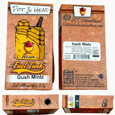 The Pot & Head Fuel Tank turns Gush Mintz Live Rosin into a full-flavor, solventless dab you can take anywhere. Smooth mint and creamy kush roll together with a melt-you-down high that builds slow and hits heavy. Big clouds, loud terps, and pure rosin character make this a proper dab experience, delivered through a tank built for easy, on-the-go hits. • Type: Hybrid • THC: 62% • Effects: Euphoric, Heavy, Melted Meet the Tank: The Pot & Head Fuel Tank turns top-shelf rosin into full flavor on demand. This 0.5g All-In-One is refillable up to 4x and powered by a mesh ceramic heating core for dense, terp rich vapor every time. USB-C rechargeable with dual activation so you can hit it your way, by draw or button. Preheat mode keeps it primed. Auto shut off wraps it up right.