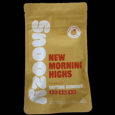 Waking up is hard sometimes—but with Snoozy’s New Morning Highs, you can start your day with calm clarity and lasting energy. These all-natural, cannabinoid-rich gummies are designed to help you greet the morning with focus, lightness, and a gentle boost, setting the tone for a productive and positive day. Formulated with a balanced blend of THC, CBD, and CBG, each gummy supports mental clarity, mood enhancement, and calm energy, making them the perfect daytime complement to Snoozy's nighttime Sleep with Benefits gummies. Crafted with organic and vegan ingredients, these gummies offer a clean, feel-good experience you can trust—without artificial additives, gluten, or unnecessary fillers. Active Cannabinoids (Per Gummy): 5mg THC 5mg CBD 5mg CBG Package Total (20 Gummies): 100mg THC | 100mg CBD | 100mg CBG Key Features: Supports daytime balance, mental calm, and natural energy All Natural, Vegan, Gluten-Free Made with organic tapioca syrup, fruit pectin, and real orange concentrate Naturally flavored and colored Ingredients: Sugar, organic tapioca syrup, reverse osmosis water, fruit pectin, organic orange concentrate, natural flavoring, natural food coloring, cannabis extract, citric acid, sodium citrate, sunflower lecithin Note: Manufactured in a facility that uses tree nuts Seize the day with Snoozy’s New Morning Highs—gentle energy, clear focus, and a calm mind in every bite. Effects may vary. Consume responsibly.