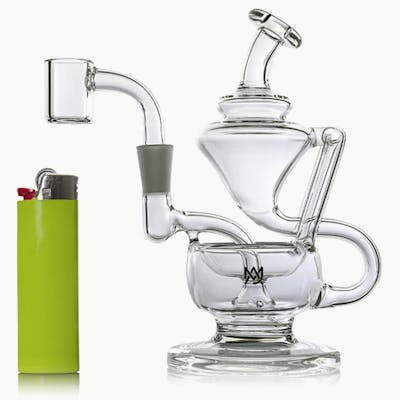 The Claude Mini Rig pays homage to our original Merlin Dab Rig by reimagining water direction and filtration. Named after an original inventor of the ancient Roman aqueduct system, the Claude Mini Rig alters how water is utilized, enriching your dabbing experience. Building on our classic recycler rig design, we've added aesthetic aqueducts that guide water into two clear turbines. These turbines cool the vapor with each inhale, delivering a perfect flavor profile with every pull. The Claude Mini Rig, a unique double uptake recycler rig, has protruding arms and an asymmetrical look that adds a touch of elegance to your collection and boosts the rig's performance. Despite its intricate design, the Claude Mini Rig is a sturdy piece. Crafted from high-quality glass, it can withstand high temperatures and resist accidental falls. It's also user-friendly, making it suitable for beginners and a favorite among daily users due to its ease of cleaning. The Claude Mini Rig features a built-in oil catcher for reclaiming any remaining product, ensuring no concentrate is wasted. A compact chamber under the quartz banger ensures that every last drop hits hard. The two-turbine design changes water direction and circulates it through multiple chambers, providing a visually appealing experience and cooling the vapor to a comfortable inhalation temperature. With complex curves providing grip points and a wide, durable base, the Claude Mini Rig is easy to handle and nearly spill-proof. Like its predecessor, the Merlin Dab Rig, it incorporates a splash-resistant design, keeping your lips clear of vape-infused water. The unique design ensures water stays within the rig, allowing the smoke to swirl upwards for a smooth, flavorful inhale. With the Claude Mini Rig, you'll experience a terp-filled vapor's whirlwind journey. This innovative design offers a smooth and flavorful experience, elevating each dabbing session. The Claude Mini Rig is a testament to our commitment to enhancing your dabbing journey.