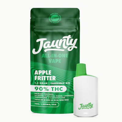 Apple Fritter | AIO Palm 1.5gApple Fritter is a flavorful hybrid with sweet, pastry-like notes of apple and earth. Its balanced effects bring relaxation with a playful, uplifting edge - a delicious treat for day or night.Jaunty Palms combine cannabis-derived terpenes with distilled cannabis oil, delivering true-to-strain flavors and effects-driven profiles in a discreet, portable device - ideal for on-the-go use.