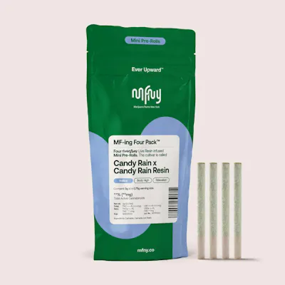 For our resin infused pre-rolls (four packs), we start with premium, hand-trimmed whole Candy Rain flower then infuse it with our in-house made Candy Rain live resin HTFSE (High Terpene Full Spectrum Extract from fresh frozen buds) totaling three quarters of a gram in weight. This process creates a higher potency, flavorful product, as Candy Rain recalls flavors of sweet candy and zkittles. Potent and high in THC, this product is a treat for experienced cannabis consumers. No shake, no trim. Just the very best of our craft cannabis, ready to enjoy. Exclusively single-sourced at MFNY in the Hudson Valley