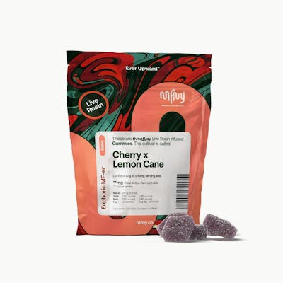 Cherry x Lemon Cane | Live Rosin | 10pkA must for edible lovers, these palate-pleasing Cherry x Lemon Cane gummies are unlike any other edibles you've tried. Our vegan, full-spectrum, cultivar-specific gummies are infused with MFNY’s premium Lemon Cane live rosin extract. Superior to distillate, live rosin is made via solventless extraction from premium fresh frozen plants. We use the minimum amount of sugar to highlight all the sweet citrus flavors of the Lemon Cane cultivar, paired with the natural flavor of cherry.
