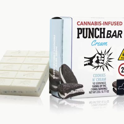Cookies 'N' Cream Bar | 100mg | 10pc ScoredA classic favorite reimagined — the Cookies ‘n Cream PunchBar. Indulge in the perfect blend of silky white chocolate and the satisfying crunch of real cookie pieces. Every bite delivers creamy sweetness and irresistible texture for a decadent treat you’ll want again and again.Made with premium distillate.