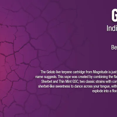 GELATOIndica DominantTERPENE PROFILE:Beta-CaryophylleneLimoneneAlpha-HumuleneThe Gelato live terpene cartridge from Magnitude is just as deliciously sweet as the name suggests. This vape was created by combining the flavors and aromas of Sunset Sherbet and Thin Mint GSC, two classic strains with complex palates. Get ready for sherbet-like sweetness to dance across your tongue, with berry and citrus notes that explode into a floral confection on the exhale.