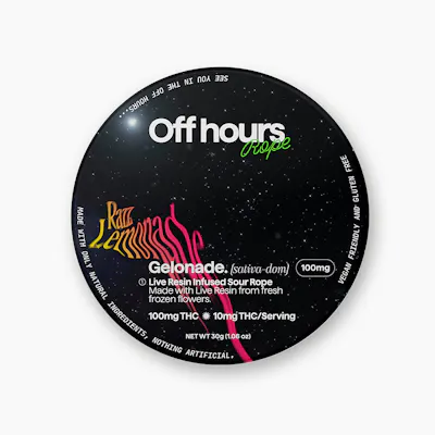 Gelonade Live Resin Infused RopeFlavor: Razz Lemonade (sour) Size: 1ctStrength: 100mg THC (10mg/serving) Species/Type: Sativa-dominant hybridLineage: Lemon Tree x Gelato 41Effect: Uplifting, Social, TalkativeFlavor: Raspberry LemonadePairs well with: Socializing, Going outOff Hours Sour Razz Lemonade ropes are infused with Gelonade Live Resin for an uplifting, chatty high. Each rope is naturally flavored with sweet raspberry lemonade to complement lemony Gelonade.Suggested use: Start with 1/2 of a section. Wait 1 full hour before increasing dose. Ingredients: organic cane sugar, reverse osmosis water, organic tapioca syrup, organic fruit juice from concentrate, fruit pectin, organic fruit flavoring, natural food coloring, MCT oil, cannabis extract, soy extract, terpenes, malic acid