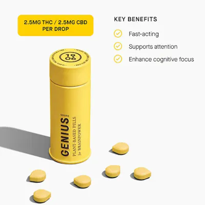Genius promotes cognitive performance through a blend of cannabis, caffeine, and five plant medicines. Swallowable pills with rapid onset of 20 minutes. Vegan, calorie-free, sugar-free, and gluten-free.2.5mg per individual drop.2 Drops equals one serving. 5mg THC, 5mg CBD, 5mg CBG per serving.15 Servings per package. 75mg Total per package.