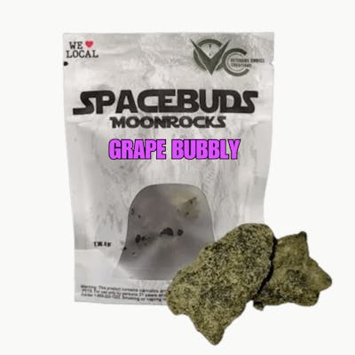 Spacebuds Moonrocks: Grape Bubbly 4gTraditional Classification: HybridEffects: Euphoric, Relaxing, Uplifting, CreativeTHC: 60%Net Weight: 4 gramsDescription:Pop the cosmic cork with Spacebuds Moonrocks - Grape Bubbly! Infused with hash rosin and bubble hash, these flavorful Moonrocks burst with fruity grape aromas and a sparkling kick inspired by Grape Ape and Champagne Kush terpenes. Finished with a dusting of powdered kief, Grape Bubbly offers a bold, out-of-this-world experience that’s perfect for sparking creativity or relaxing after a long day. Celebrate every puff with stellar craftsmanship from Veterans Choice Creations.Ingredients: Flower, Hash Rosin, Proprietary Terpene Blend, Bubble Hash, KiefWhy Choose Us?Made in Gloversville, NY, Veterans Choice Creations is a proud 100% Service Disabled Veteran-owned company. We pay fair wages, offer full benefits, and care about our community. When you choose Veterans Choice Creations, you're not just supporting a company but an entire community.How to Consume:Smoking: Break the Moon Rocks into smaller pieces and mix with your regular cannabis flower in a pipe or rolling paper.Vaping: Use a vaporizer designed to handle concentrates. Place a small amount of Moon Rocks into the chamber and vape at a low temperature.Recommended Dosage:Beginners: Start with a piece about the size of a BB pellet (~0.1 grams). Wait 30-60 minutes before considering additional consumption.Experienced Users: A pea-sized piece (~0.2 to 0.3 grams) should suffice. Again, wait 30-60 minutes to assess effects.