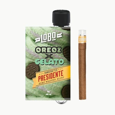 Oreoz x Gelato (Presidente) | 2g | BluntOreoz x Gelato - Hybrid - Sweet, buttery chocolate notes with a touch of gas make this hybrid your next fave smoke. The Lobo Presidente is too refined to be called a blunt! Glass-tip, hemp paper wrap and premium flower, triple-infused with SAUCE, DIAMONDS and dry sift HASH. 2g of terpy potent nugs finished with a reusable glass-tip.