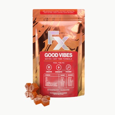 Elevate your day with our Good Vibes Sativa Day Time Formula, a delicious strawberry-infused gummy designed to spark creativity, boost energy, and sharpen your focus. Each mouthwatering bite is perfectly balanced with 10mg THC, 5mg CBC, and 5mg CBD to deliver a potent yet harmonious effect that keeps you lively and inspired all day. Just looking to take the edge off? Our gummies are easy to Microdose with our unique "X" shape that provides 1/4 of a serving with each easily breakable tab.Infused with a nutritional boost of B12, Green Tea Extract, and Phosphatidylserine this formula is engineered to enhance mental clarity and sustain energy, making it the ideal companion for busy days, creative sessions, or any time you need to stay on top of your game.Experience the burst of delicious Strawberry Sunshine flavor while enjoying a naturally uplifting, creative, and energetic high. With FX Gummies, you control your FX—one perfectly portioned gummy at a time.