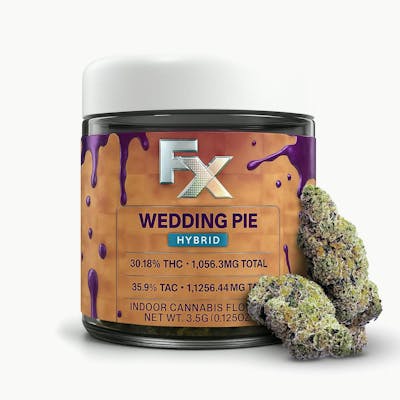 Wedding Pie from FX is a rich, decadent indoor cultivar built for smokers who crave depth, flavor, and a slow building full body melt. This genetic blends the sweetness of Wedding Cake with the fruity punch of Grape Pie, delivering a smooth, dessert forward experience that tastes as good as it feels.The aroma hits with creamy vanilla, ripe berries, and a hint of gas that rises the moment you open the jar. The flavor follows with layers of sweet dough, warm spice, and a bright grape finish that coats the palate. Each nug is dense, frosty, and grown in a precision controlled indoor environment to lock in potency, terp profile, and visual appeal.The effect is calming, euphoric, and heavy in the best way. Expect a warm mental lift that settles into a deep body relaxation that melts stress away without taking your clarity. Wedding Pie is perfect for winding down, tapping into creative flow, enjoying food and music, or ending the day with comfort and ease.FX Indoor Flower. Big Hit. Bold Flavor. Pure Bliss.