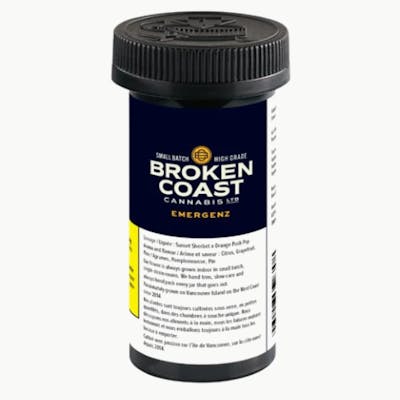 Introducing EmergenZ, an incredibly flavourful, sativa-dominant cultivar crossed between Orange Push Pop and Sunset Sherbet. Reaching potencies of 24-30% THC, this cultivar is potent and delicious. Indoor grown in small batches on the West Coast, Broken Coast strives to push the limits on what craft flower can be. Experience notes of citrus, grapefruit, and pine from large, trichome-rich buds. Top terpenes include Beta-Myrcene, Beta-Caryophyllene, and Limonene.