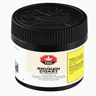 BC Selects is a new offering from Broken Coast that deepens our commitment to offering the very best; an exclusive and limited first release of new Broken Coast strains to the recreational market. These strains are chosen by Master Grower Kevin from hundreds of in-house phenotypes, as the best-in-class genetics showcasing Broken Coast’s commitment to cannabis excellence; cola quality buds, rich trichomes, bold terps & unmistakable Broken Coast quality. Non-irradiated, these lots allow BC consumers to experience these strains in their purest state. BC Selects’ second release is Pineapple Marker, the 143rd phenotype of a Pineapple Marker genetic origin. This sativa-dominant strain delivers a tropical and sweet flavour with a citrus finish, and is high in cis-nerolidol, alpha-thujone, and beta-caryophyllene.