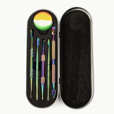 Take your concentrates on the go with this new Anodized Dabber Set from LIT® Silicone. Includes multiple tools and a handy dab jar for storing concentrates. All of this is stored inside of the metal carrying case that offers a discreet and simple way to bring your dab tools on the road.