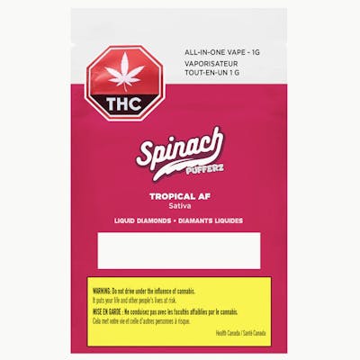 Spinach PUFFERZ™ is an all-in-one vape that’s designed to deliver bigger, and more potent hits thanks to a liquid diamonds infusion and dialed up the flavour. The Spinach PUFFERZ Tropical AF all-in-one vape is a special kind of flavour experience from that first puff to the end of the chamber. Tropical AF takes next level fruity and floral tastes to new heights thanks to the inspiration from a strain with Pink Rozay and White Runtz lineage. With unique and hard-hitting liquid diamonds and botanical terpene infused distillate, this vape isn’t just flavourful ‘AF,’ it’s potent ‘AF’ with a super charge of 96.7% THC in every puff.