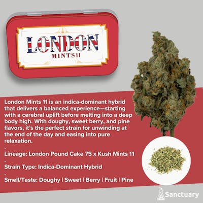 London Mints London Pound Cake 75 x Kush Mints 11 Hybrid - Indica Leaning Effects London Mints 11 is an indica-dominant hybrid that delivers a balanced experience—starting with a cerebral uplift before melting into a deep body high. With doughy, sweet berry, and pine flavors, it’s the perfect strain for unwinding at the end of the day and easing into pure relaxation.