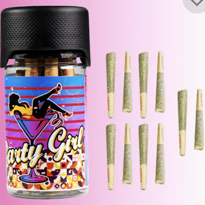 10 Pack - 10 X .5 Gram Prerolls Per Pack Party Girl: This Party Girl is a sativa dominant strain with lemon pepper terps that will grip an entire room and demand your full attention. Her flowers are the rock-hard buds you’ve come to expect from RMG with a thick coat of glistening crystals. Party Girl rocks your mind and body evenly as a true party animal should. Your ‘go-to gal’ when it’s time to party!