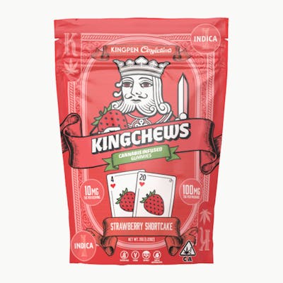KingChews 10pk - Indica Strawberry Shortcake 100mg by King Chew packs bold flavor and consistent THC potency in every bite. These indica gummies offer a delicious, elevated experience with sweet, juicy taste and reliable effects that soothe and unwind. Perfect for discreet enjoyment or on-the-go elevation, King Chews deliver precision dosing and long-lasting satisfaction. King Chew — flavor that rules, potency that lasts. This strain typically features rich, layered terpenes notes and may evoke feelings of calm, uplifting, serenity, enhancing the overall smoking experience. Expect a flavor profile of sweet berry, jammy fruit, and subtle tartness, alongside feelings of cozy, happy, and gently euphoric effects, ideal for unwinding and settling into a relaxed headspace, highlighted by aromatic depth. The experience often brings peaceful nighttime drift, shaped by the strain’s terpene expression. Powered by myrcene and linalool for a soothing, cocoon-like calm.. Its terpene expression often features rich layers of myrcene, guaiol, and earthy caryophyllene, shaping an experience characterized by guiding you toward a deeply restful, contemplative calm.