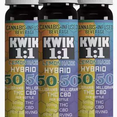 The newest addition to the Kwik product line, Kwik 1:1 combines 50mg of THC and 50mg of CBD for a deeper, more balanced high. With all the wellness benefits of CBD alongside the recreational perks of THC, Kwik 1:1 gives you the best of both worlds. Try it today and find your inner equilibrium. Contains: CO2-extracted cannabis oil infused in water with honey, lemon juice, ginger, natural flavors, turmeric, lemon extract, orange oil, & citric acid.
