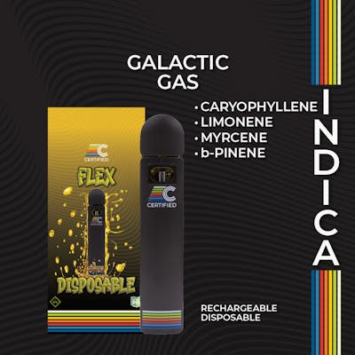 1g Indica FLEX All-In-One Disposable Vape | Strain: Galactic Gas AROMA: Pungent gasoline, skunk, sour lemon. EFFECTS: Hungry, relaxed, sleepy. DESCRIPTION: Careen through the galaxy to the Diesel Nebula, where a pungent fusion of sour citrus vapor, skunk, and eye-watering gas creates one of the dankest marvels of the universe: Galactic Gas terpene strain. This Gelato #45 x Gushers cross is a top-tier experience through a heavy gas fog with bright flashes of sour lemon, earth, pine, and spice that dissipate into the skunky, fuel-laden atmosphere. — ABOUT: Discreet and effective; these all-in-one vape pens are created to mimic the effects of strains without a predominant cannabis aroma & flavor. We carefully source high-quality and flavorful botanical terpenes to provide a unique medication experience. More flavor, similar effects! — NEW HARDWARE: Packaged in a CCELL FLEX Disposable & Rechargeable All-in-One. • No Heavy Metals • Inhale Activated • Huge Clouds without Clogging • Flavorful & Smooth Hits **USB-C charging** Day(s) Supply: 2