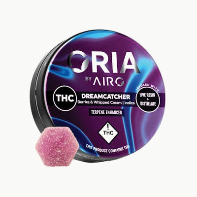 100mg Live Resin + Distillate Gummies | Strain: Dreamcatcher ORIA by AIRO Dreamcatcher 100mg THC Gummy Pack 10mg THC per Gummie -- Oria Dreamcatcher Indica gummies by Airo Brands bring you tastes of berries and whipped cream enhanced with Myrcene, b-Caryophyllene, and a-Pinene. Live Resin infused, full spectrum, lipid-encapsulated technology. Natural ingredients, vegan, and gluten-free. -- Flavor notes: Berries, whipped cream, sweet -- Ingredients: Tapioca Syrup, Sugar, Water, Natural Flavor, Less Than 2% of: Pectin, Natural Cannabis Oil, Cyclodextrin, Sodium Citrate, Citric Acid, Malic Acid, Coconut Oil, Natural Color, Natural Terpene Blend