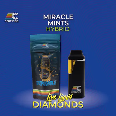 1 gram Hybrid Live Liquid Diamonds iKrusher Disposable | Strain: Miracle Mints NEW FORMULATION: Our Live Liquid Diamonds represents the pinnacle of Live Resin vaping - clean and flavorful hits with potent effects made from your favorite CERTIFIED strains! — LINEAGE: Alien Cookies x Kush Mints #11 CATEGORY: Indica BREEDER: Seed Junky x Capatulator AROMA: Fruity, candy, hints of cake. — PRIMARY TERPENES: 1.43% Limonene | 1.3% Linalool | 1.13% Caryophyllene SECONDARY TERPENES: 0.65% Myrcene | 0.32% Humulene | 0.3% Guaiol | 0.24% Eudesmol | 0.24% Bisabolol | 0.19% Terpineol | 0.17% Fenchol | 0.16% b-Pinene | 0.1% a-Pinene — ABOUT: At harvest plants are immediately freeze-dried in order to preserve the terpene and cannabinoid profile of the cultivar. Processed through hydrocarbon extraction, heat and pressure are utilized to leave behind a terpene sauce and THCa diamonds. Live Resin is often noted to include increased flavor as the freeze-drying process preserves the cultivar’s profile. — HIGHLIGHTS: • Full Spectrum • 100% Cannabis-Derived Terpenes and Cannabinoids • Cultivar Specific • Butane Extracted — HARDWARE: • Rechargeable (micro-USB) • Side viewing window to check oil levels • Ceramic technology atomizer with anti-clogging inhale activation • Set to 3.6V Day(s) Supply: 2